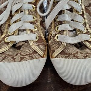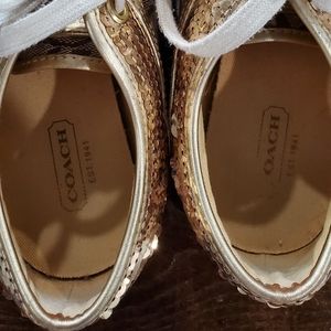 Very cute! The usual Coach sig fabric sneakers but with gold sequins around the top plus gold piping down the front.