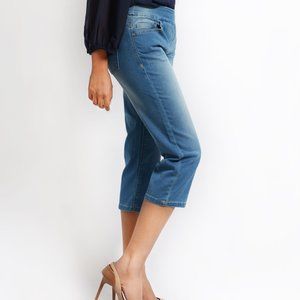 This women’s capri pants features a sleek silhouette and flattering stretch denim. Easy to wear, flat front, elastic waistband, non-functional fly and five-pocket styling.