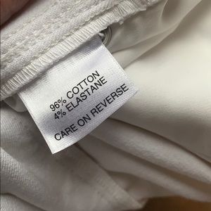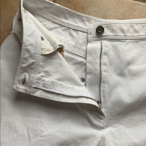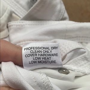 These white jeans are a cropped length with a straight fit and have elastane for a hint of stretch, button-and-zipper fly, 5 pocket styling, silver studded grommet back pockets, dry clean only.