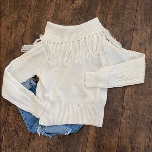 White knit off the shoulder sweater with fringe. Cropped fit. First photo style idea.