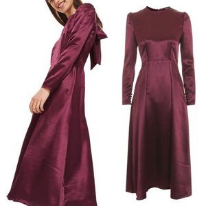 Demurely styled at the front, this shimmering satin midi dress changes its attitude with a spine-tingling open back crowned with a flirty bow.- Hidden back zip with tie closure - Jewel neck - Puffed long sleeves with button cuffs - Fitted waist - Unlined - 100% polyester - Machine wash, line dry - Imported.