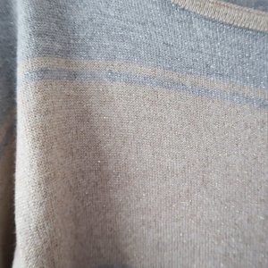 Metallic shimmer in gold and silver stripes brings this 3/4 sleeve dolman pullover to life in laidback luxury.