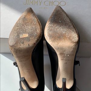Authentic Jimmy Choo calf leather pointy 142Houry black heels. Used and very good condition. Side buckle enclosures. Size 38. 4.5” heel. Comes with original dust bag and shoe box.