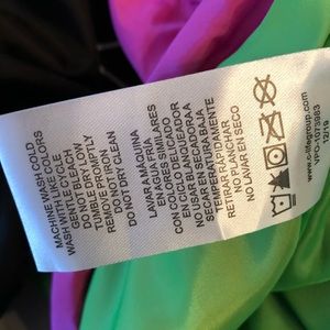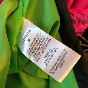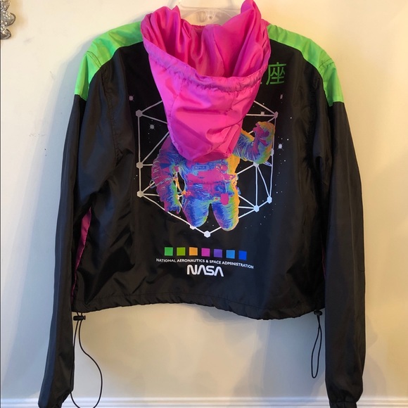 80’s-90’s inspired Black and Multi Colored Neon NASA Windbreaker. Mid zippered front. Front Velcro pocket. NASA imprinted in white. Pink Hood. Neon mix of colors form the astronaut within the sphere on the back. Color blocks and NASA defined writing on the bottom. Adjustable toggle at the bottom. This Out of this world old school Jacket will make a statement!