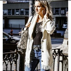 Button front cardigan. Perfect for spring! Fringe detail. Button up plus a tie belt. Cream color. 100% acrylic. Uniq from Threadzwear