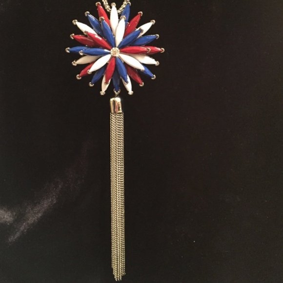 Red/White/Blue Star with Rhinestone in Silver tone chain with tassel. Hangs 16" from neckline & the tassel is approx 4"