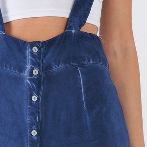 Overall skirt features: front button closure, adjustable overall straps, maxi length, mock denim blue acid wash, center slit, unlined, stretchy.