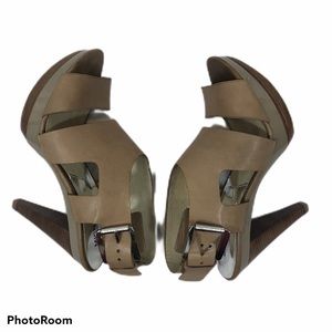 In fantastic condition!!!! A few small faint water stains on the one shoe, see close up—very difficult to see. Beautiful Michael Kors steamy heels with large silver buckles. Leather upper. Has a kind of patent leather on the platform part of the shoe, no nicks or marks on the heels. Size 9.5