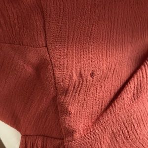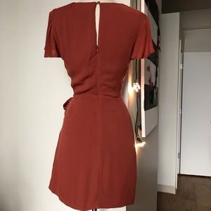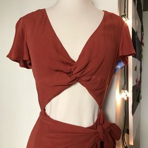 Adorable Evelyn cutout twist-front mini dress by Majorelle (sold at Revolve). Size XS. Rayon. Partially lined. Deep orange “Terracotta” color. Wrap-style with tie front. Back zip closure. Flutter sleeve. Brand new with tags! There is a minor stitching flaw near back zipper (7th photo) and some minor snags at left side near bust (6th photo). Neither are very noticeable when worn.