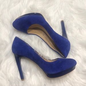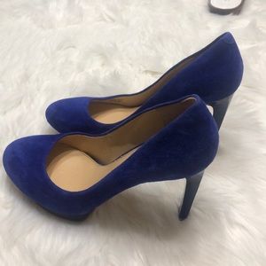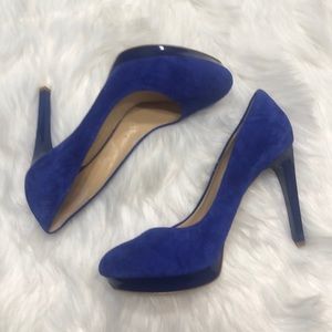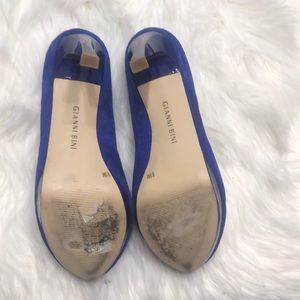 Gianni Bini Blue leather upper pumps size 9.5. Heel height 4.5 inches platform .75 inches. Excellent used condition. Comfortable to walk in. Small spot On left toe shown in last picture. Difficult to see while wearing. Smoke-free pet free home.