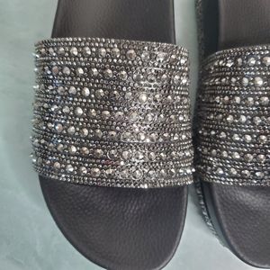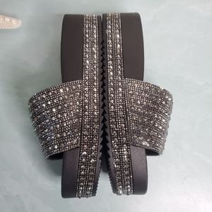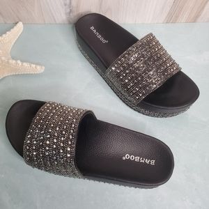 New! Black Rhinestone Wedge Slides