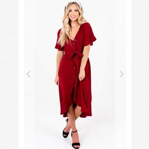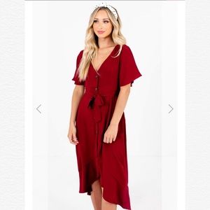 It features a button-up front, waist tie detail, and high-low ruffled hem! The partial lining adds the perfect finishing touch. Burgundy Midi Dress with black heels and a cute headband to recreate our model's gorgeous outfit!