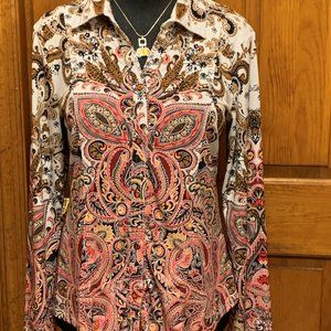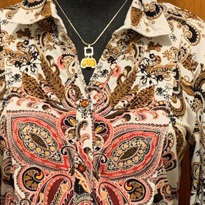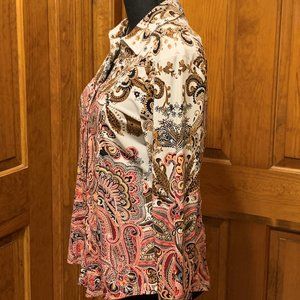 JM Collection Women's blouse in gold/brown/cream/peach design, size small, 95% polyester, 5% spandex. Gently cared for, no stains, rips or flaws, in excellent used condition.
