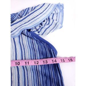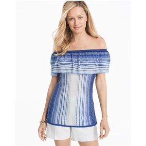 Coastal-inspired print. Off-the-shoulder flounce stripe sweater. Elasticized neckline. Rayon/spandex/metallic. Machine wash cold.Measured flat/unstretched/approx. Bust 14 in. Length 26 in.