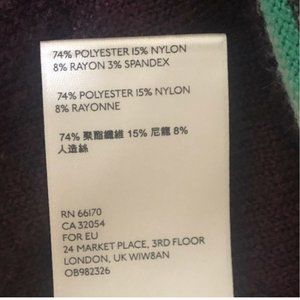 74% Polyester, 15% Nylon, 8% Rayon, 3% Spandex