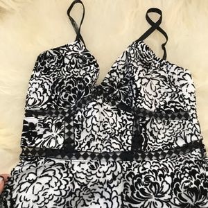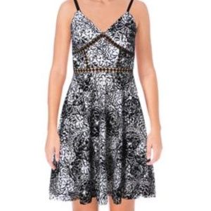 Aqua flocked black and white floral fit and flare dress. Bustier inspired detailing.