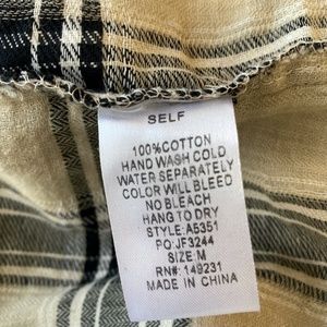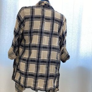 Plaid cardigan. Full-length rolled and tabbed sleeves.