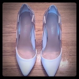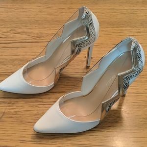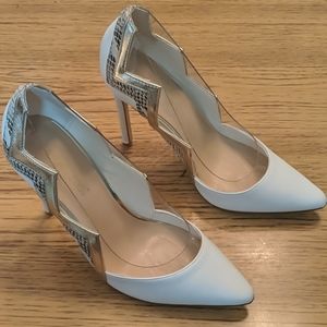 Shoedazzle white heels, snake skin and clear with zig zag pattern. 3 inch heels