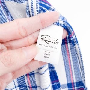 A colorful plaid RAILS top with deep side slits. Rounded asymmetrical hem. Patch breast pocket. Fold-over collar and button placket. Sleeveless.