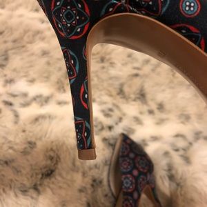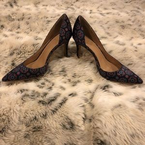 Pointy toe, size 7, and super flattering. One side is D’orsay and the other side is like a regular pump. I love these shoes and got compliments on them but after having kids, they just don’t fit. They’re in great condition!