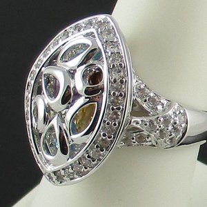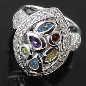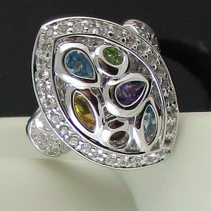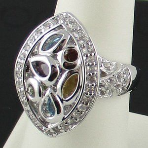 Victoria Wieck 2.14ct Multigem Sterling Silver Mosaic Overlay Marquise Ring. Design: Marquise-shaped table; Bezel-set multishaped multigems cluster on central overlay over a bed of pave'-set, round White Topazes; Pave'-set round White Topazes border table and encrust split, geometric shoulders; Geometric cutouts on open gallery; Finished undergallery. Ring measures approx. 3/4" Long x 1/2" Wide. Ring is stamped .925 Sterling Silver. Boxed.
