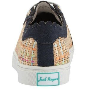 NWT Jack Rogers classic low-profile lace-up sneakers with colorful woven upper and scalloped trim leather detail. Set on a clean white cupsole to enhance the street-ready look. Lace-up style. Padded footbed. Textile and leather upper/textile lining/textile and rubber sole.