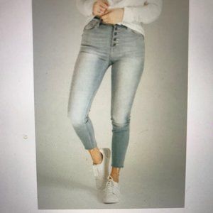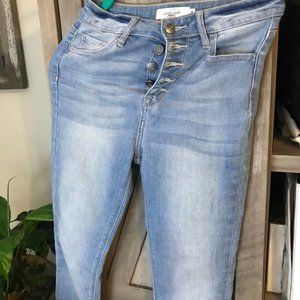Carly Jean denim, raw hem, button front, real stretchy, high rise