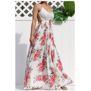 Beautiful Off-White Coral Floral Boho Maxi Dress with Crochet Lace Open Back Top. Adjustable spaghetti straps. Elastic waist. Fully lined. Polyester self and lining. NWT