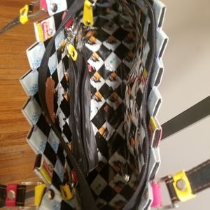 Used Black & white candy wrapper tote with zipper. yellow and red accent. Small black zipper pouch inside with zipper. In great condition.