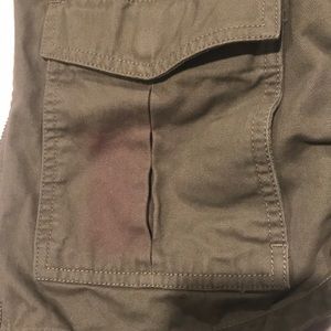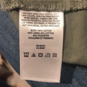 Light jacket in a forest green color. 100% cotton. Four front pockets. Zips. Interior drawstring around the waist. There is a light stain on one of the pockets I just noticed, that I will try to wash out. Pricing reflects that. About 26” total length.