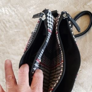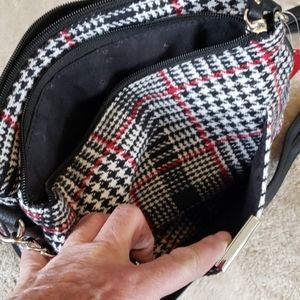 New with tags. Unique handbag cross body part chains adjustable strap.To zipper compartments one snap compartment on top 1 zipper pocket on back 1 slide pocket in front. Black red and white plaid.