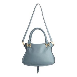 A textured, curvy flap—branded by subtle embossing—secures the front pocket of a sophisticated satchel crafted from lightly pebbled calfskin and topped with wrapped handles and an optional strap.