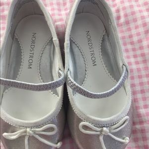 Super cute like new Nordstrom Toddler size 5 Mary Jane style dress shoes- silver metallic colored with little bows on the toes ( small scuff on the toe near the bow on one shoe- reflected in the price)