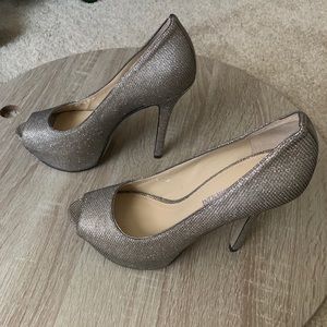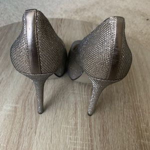 Enzo Angiolini Eatanen Gold/Silver Sparkle Peep Toe Stiletto, Sz 5.5. Used, in good condition. Shoes inside show wear as do the soles. Glitter remains in great condition!