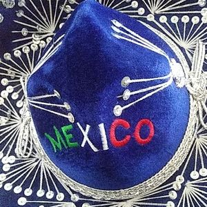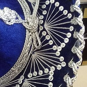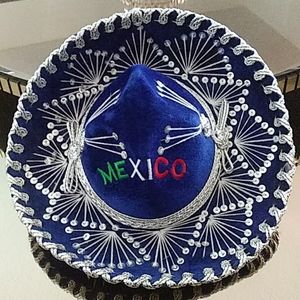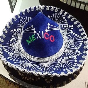 BEAUTIFUL!!! Felt and Sequin Sombrero from Mexico made by Salazar Yepez Hats. Royal Blue Felt with silver sequins. Silver cording. Mexico in felt letters on top front. Excellent Condition. Measures approximately 19.5" in Diameter and 21" around the inside.
