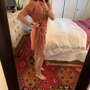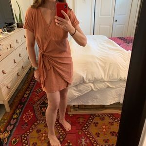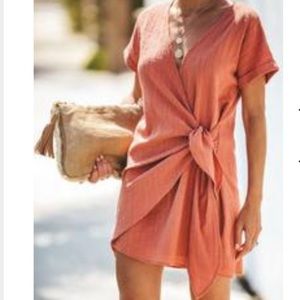 “Kauai Crush Woven Wrap Dress” in a peach color and by Peach Love from from Vici Dolls.