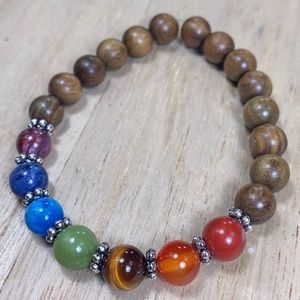 This handmade bracelet includes seven (7) 8mm colored authentic crystal beads and 8mm wood beads and nickel & lead-free silver spacer beads. Each bead type has been selected carefully for its benefits and healing properties for each of the 7 chakras.