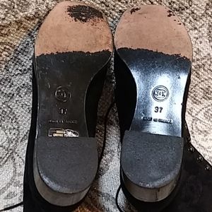 Rare 1990's Vintage Chanel CC Logo Moto Combat Black Suede Leather lace up Boots! Amazing short boots in excellent pre-loved condition. Minimal wear. See photos. Soft black suede outside, 8 grommet/rivet laces, and cream colored kid leather inside. 1 1/2" block heel, and rises to approximatly 3" above ankle. Perfect signature wardrobe piece. Shop with confidence, Posh will authenticate. Made in France