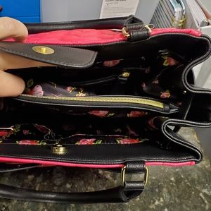 Super cute pink and black Betsy Johnson purse. 3 large compartments. Shoulder strap. Adjustable width of purse. Snap closure. Pretty embellishments on top. Purse has a small spot underneath and very tiny minor scuffs on gold from storing the purse. Price reflects them but honestly barely if not at all noticeable. Just want to be transparent.