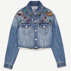 Zara Floral Sequin Cropped Denim Jean Jacket