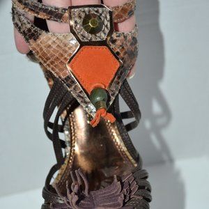 Offered is this darling pair of Chinese laundry stiletto heels in snakeskin with stud & leather fringe embellishment. THe shoes show moderate wear and are free from odors and blemishes. The fringe is a tad stiff and could use a conditioner. Please see all images for description of material condition.