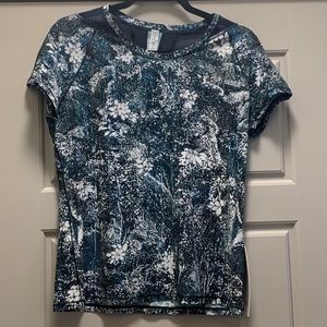 Stay cool during hot workouts in this cool-to-the-touch tee. Two different kinds of mesh fabric panels in the back give you the ventilation you need. Slim Fit, hip length. Blue/green color. Size 6; NWT