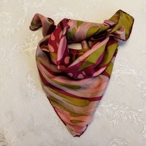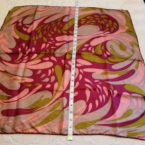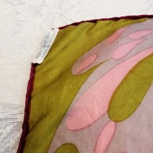 Excellent condition, made in Italy, 100% silk, rolled edges, two labels, inspired by psychedelic art of its day. The color spectrum is fabulous. We have retro olive, retro pink, retro magenta + retro pale blue. Hand washed by me, collectible + researched. Simon, 1865-1934, was known for his futuristic designs for window displays on Fifth Ave. He founded that Manhattan area with Herman Flurscheim to become a world-class fashion center. He invented on-site parking for shoppers + outlet mark-down retail.