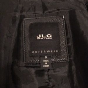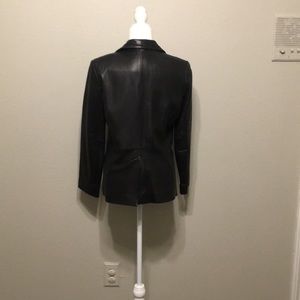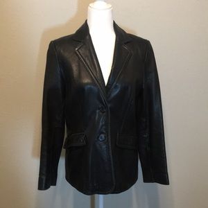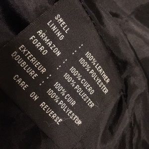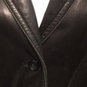 Genuine soft leather jacket. Lined, shows some wear along edges and pockets but could be easily improved with leather cleaner/polish.