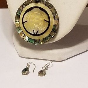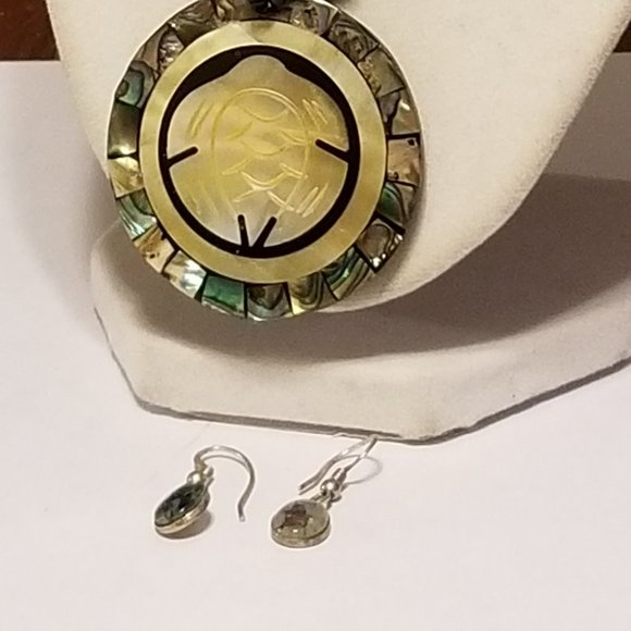 Beautiful turtle medallion made from mother of Pearl & black seed bead twisted necklace. Easy slip on clasp through a knot or put it over your head for some. Delicate earrings that match with a glass multicolor gem on sterling silver fish hooks.
