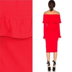 When in Doubt Wear Red! This stunning JOY HAN dress just needs a pair of heels and statements and you are ready!! This dress features an off the shoulder style, bodycon fit and high slit.