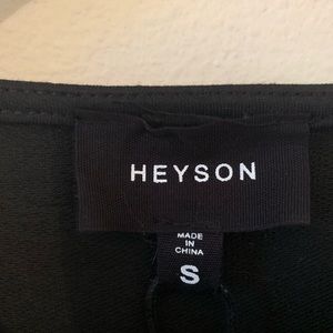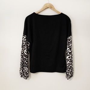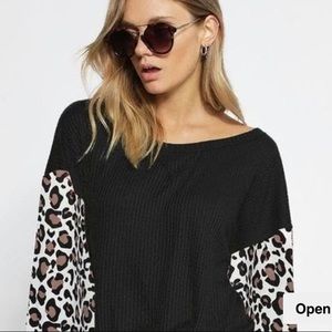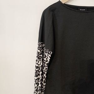 HEYSON black stretchy top with leopard arms. Slight bat wing arms. Round neckline. Elastic around the cuffs. New with the tags attached.