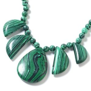 Lab Created Malachite Earrings and Necklace Set in Stainless Steel. Magnificently crafted, this incredibly beautiful set featuring lab-created malachite drop dangle earrings and princess necklace will make you feel on top of the world. Fine crafted in stainless steel, the jewels are decked with excellent craftsmanship. Stainless steel doesn't tarnish. Fabulous statement piece! One and done, and you've taken even the most basic outfit to Wow! Approx: 18-21" necklace, 1.5" earrings. Cond: NEW.