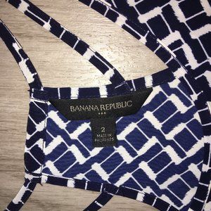 Other features: Blue geometric patterned maxi dress with tasteful below-the-knee left side slit and racer/stewpot back. 100% polyester.