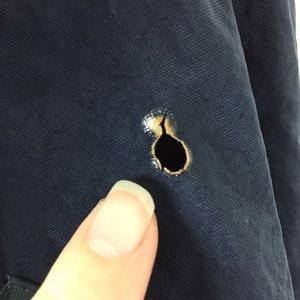 Small burn hole on the left shoulder of the jacket’s shell. See pic.
